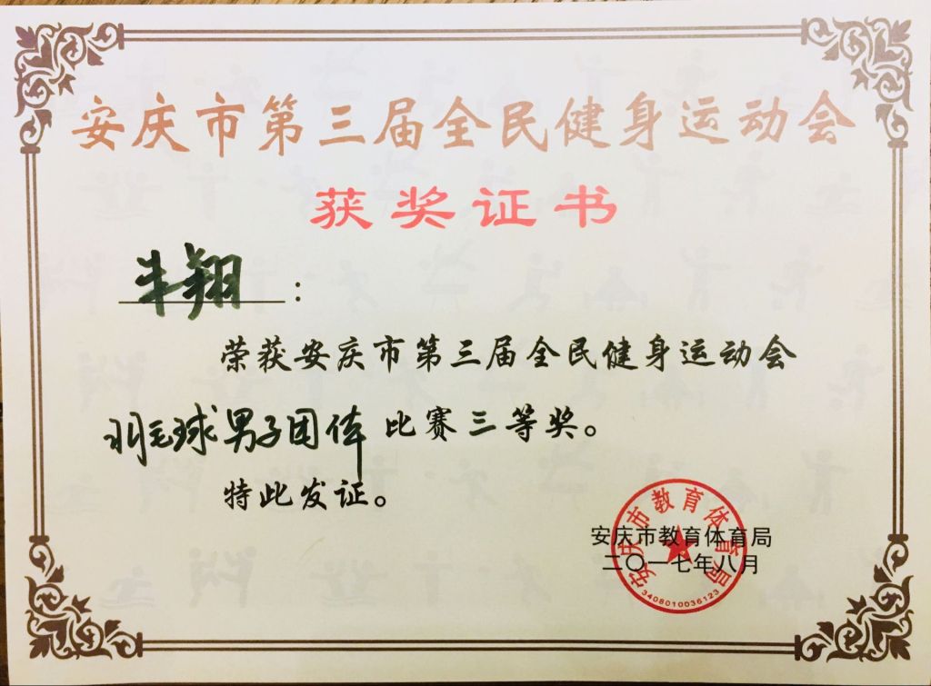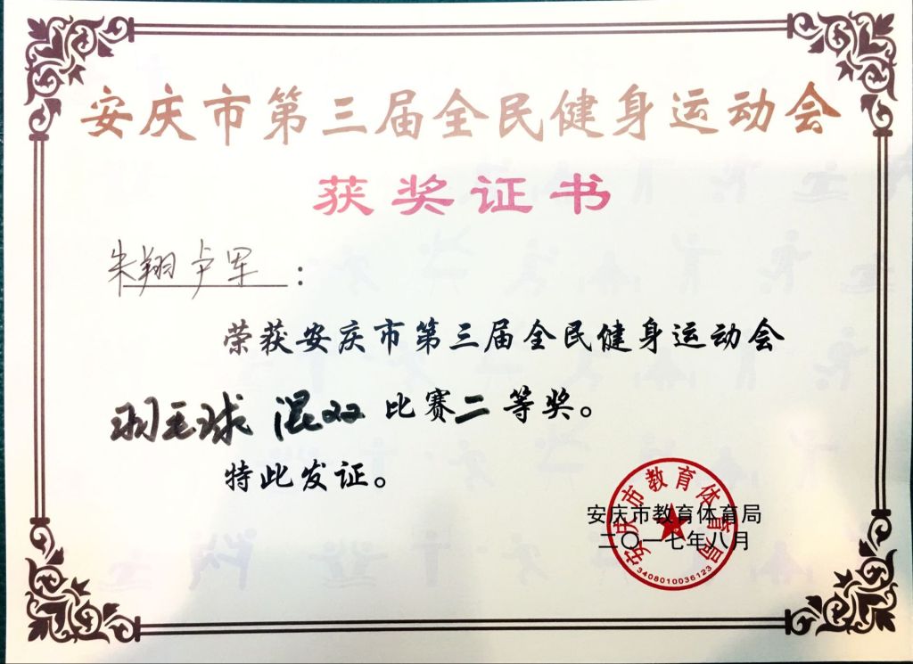 安慶市第三屆全民健身運(yùn)動(dòng)會(huì)于8月8日正式舉行。安慶分公司朱翔同志代表安徽省工業(yè)設(shè)備安裝有限公司參加羽毛球項(xiàng)目的比賽,獲得了男子團(tuán)體三等獎(jiǎng)和混雙二等獎(jiǎng)的好成績。