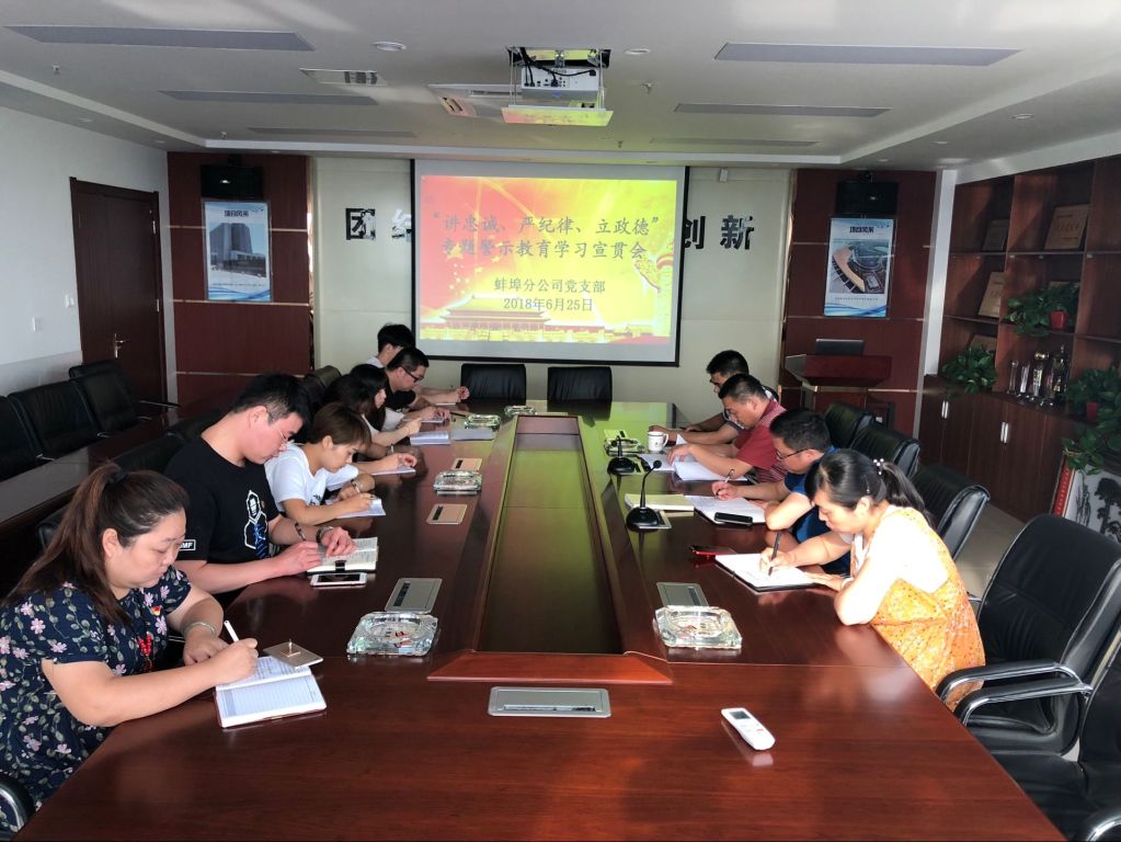 6月26日下午,蚌埠分公司黨支部召開了“講忠誠、嚴(yán)紀(jì)律、立政德”專題警示教育學(xué)習(xí)宣貫會,分公司黨員及機(jī)關(guān)員工參加會議。