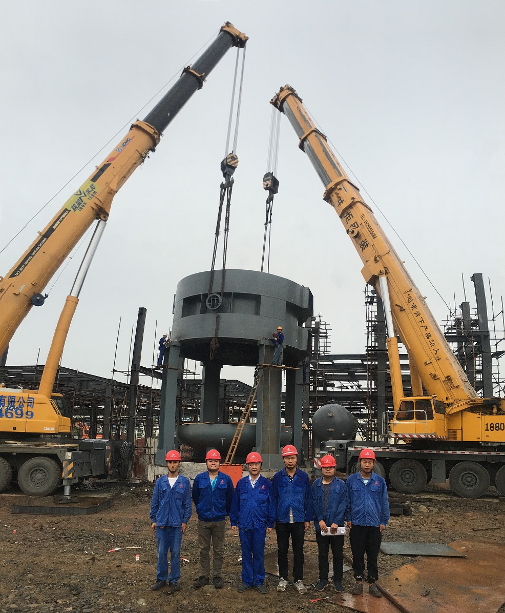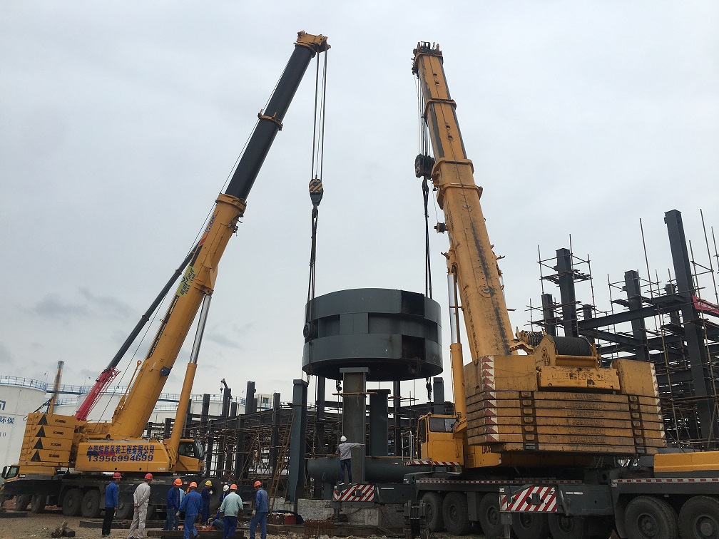 本次吊裝的反應(yīng)器中段部分重達(dá)220噸,分公司領(lǐng)導(dǎo)高度重視,吊裝前期,邀請(qǐng)公司總工吳繼成、總工辦主任牛守義和安全部王岳濤經(jīng)理親臨項(xiàng)目部參與設(shè)備吊裝的專(zhuān)題方案討論定稿工作。當(dāng)日上午,吊裝現(xiàn)場(chǎng)準(zhǔn)備工作緊張卻又有條不紊的進(jìn)行,項(xiàng)目經(jīng)理李子鳳向全體“參戰(zhàn)”員工進(jìn)行了安全交底,工作人員對(duì)兩臺(tái)分別為500T、350T吊車(chē)的站位及性能再次確認(rèn),現(xiàn)場(chǎng)機(jī)具、人員均按既定方案實(shí)施。分公司經(jīng)理史崇松、業(yè)主單位負(fù)責(zé)人、監(jiān)理全程在現(xiàn)場(chǎng)“督戰(zhàn)”,全體工作人員經(jīng)過(guò)四個(gè)小時(shí)的奮戰(zhàn),吊裝作業(yè)圓滿(mǎn)結(jié)束。