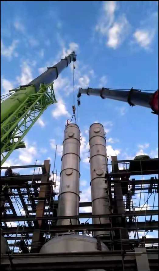 此次吊裝任務(wù),輕組份塔重20噸,純苯酐塔重28噸,項目部采用90噸履帶吊車,要求主吊一次性吊裝就位。項目施工難度大、技術(shù)要求高、各環(huán)節(jié)關(guān)聯(lián)密切,給吊裝作業(yè)帶來巨大挑戰(zhàn)。無論是分公司管理人員還是項目部一線工人,大家擰成一股繩,全力以赴投入到吊裝工作中,順利實現(xiàn)了“每一次吊裝都是承諾”的目標(biāo)。