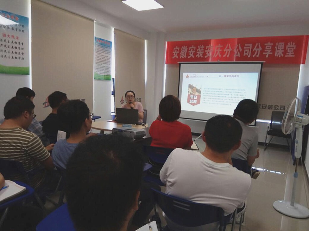 8月1日下午,安慶分公司黨支部充分利用分享課堂,組織全體員工開(kāi)展“不忘初心,牢記使命”主題教育之慶祝中國(guó)人民解放軍建軍92周年活動(dòng)。