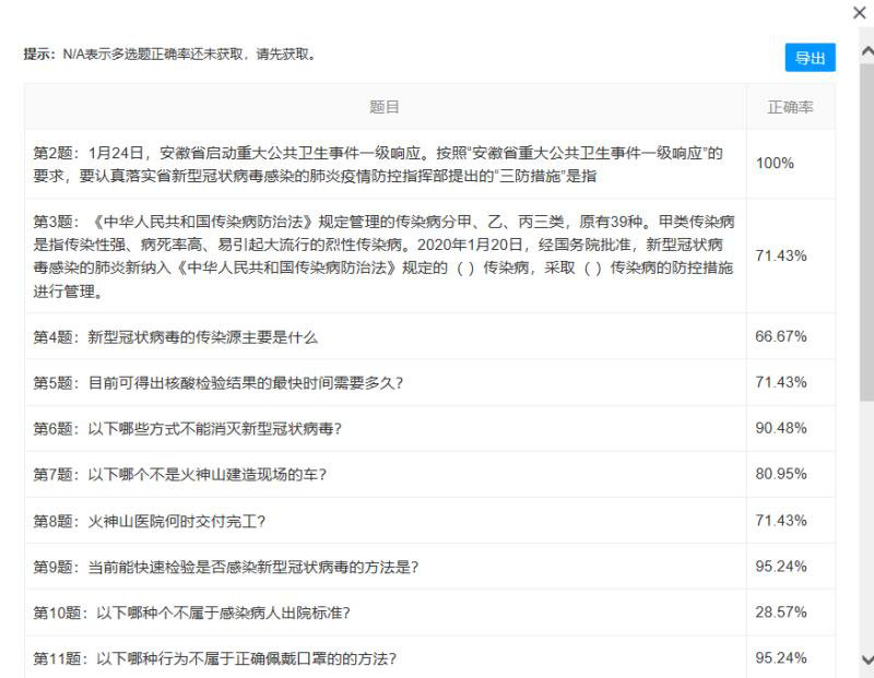 本次疫情防控知識答題通過在分公司微信群發(fā)送答題鏈接開展,內(nèi)容涵蓋新冠肺炎基本知識、疫情防控措施、員工居家防控等多項內(nèi)容,同時還對上級在疫情期間下發(fā)的各類疫情防控工作指導(dǎo)意見、措施等進(jìn)行了宣貫。此次活動,員工參與率達(dá)到了100%,不僅加強(qiáng)了員工對防疫知識的了解,還提高了預(yù)防疾病自我保護(hù)的意識,防疫知識掌握情況總體較好。通過參與答題,廣大員工進(jìn)一步了解了新冠肺炎的傳播途徑及相關(guān)防護(hù)措施,表示要努力做到認(rèn)真理性對待疫情,保持良好個人生活習(xí)慣和公共衛(wèi)生習(xí)慣,遵守疫情防控工作要求,胸懷全局、統(tǒng)一思想,堅決打贏疫情防控阻擊戰(zhàn)。