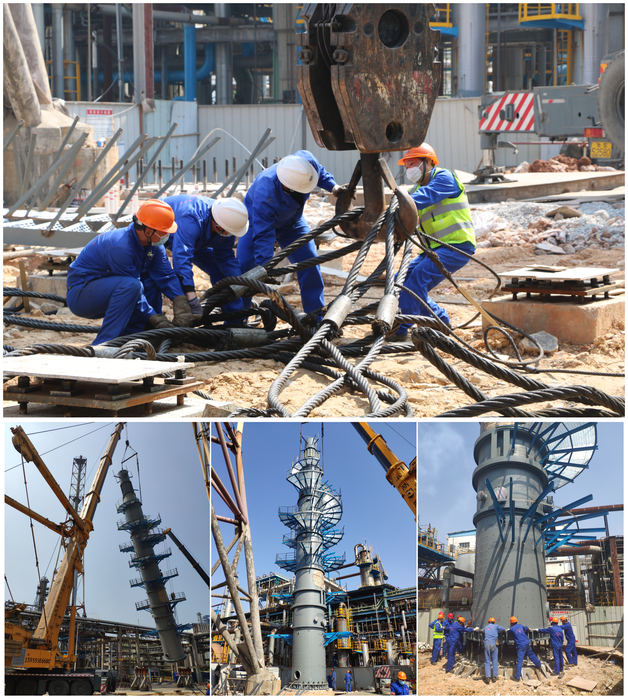 此次吊裝的脫硫塔下段,高33米,直徑3.043米,塔體及設(shè)備平臺(tái)、爬梯等附塔物總重達(dá)76噸。由于作業(yè)場地面積有限、周邊構(gòu)筑物障礙多、吊重荷載大等諸多困難,吊裝任務(wù)異常艱巨。對此,安慶分公司領(lǐng)導(dǎo)高度重視,提前謀劃,從地基處理、吊車站位、吊點(diǎn)選擇等角度,實(shí)地考察,制定針對性專項(xiàng)吊裝方案及防護(hù)措施,按照方案要求采用額定荷載500噸的汽車吊主吊,220噸的汽車吊溜索,實(shí)施雙機(jī)配合吊裝作業(yè)。吊裝前期,還特別邀請公司副總經(jīng)理高飛和相關(guān)部門負(fù)責(zé)人親臨項(xiàng)目現(xiàn)場進(jìn)行指導(dǎo)。