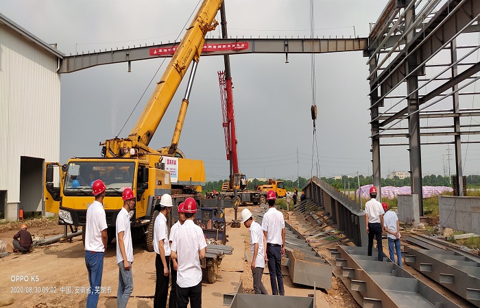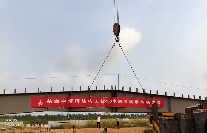 炎炎夏日、烈日當(dāng)空。8月30日上午9時(shí)18分,隨著一聲響亮的“吊裝開(kāi)始”,合肥分公司蕪湖宇培項(xiàng)目鋼結(jié)構(gòu)工程PC1/PC2廠房連接核心區(qū)“40米大跨度橫梁露天跨部分”吊裝作業(yè)正式拉開(kāi)序幕。分公司副經(jīng)理李多德趕往施工現(xiàn)場(chǎng)周密指導(dǎo),與項(xiàng)目部全體員工共同奮戰(zhàn)。
