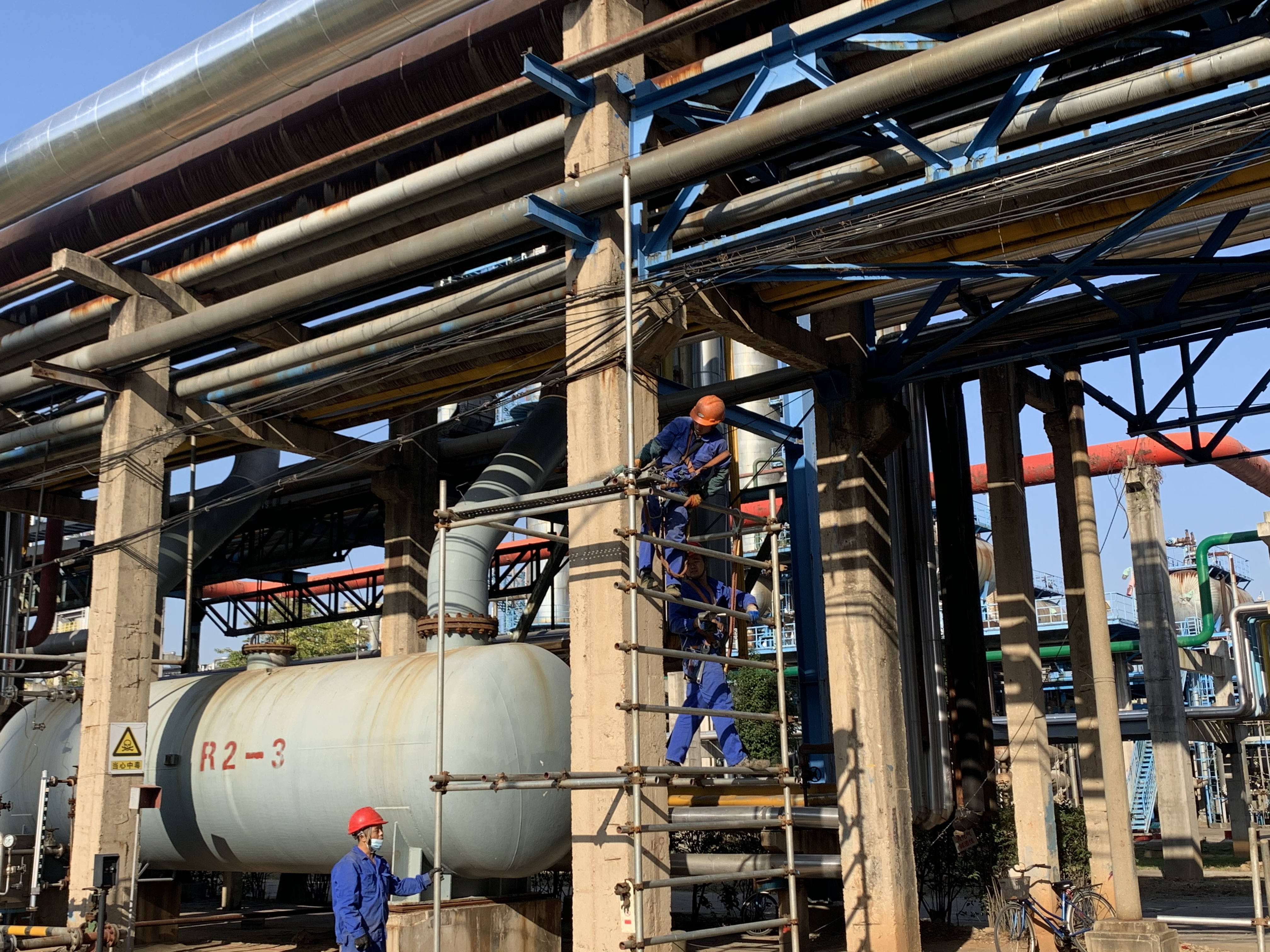 安慶石化低二腈線隱患處理項目在茅青路液化氣罐路口低Ⅱ線分支起至腈綸西圍墻內(nèi)界區(qū),對原有管道拆除換新。目前施工各項工作均已完成并驗收,相關(guān)作業(yè)物資已經(jīng)清理完畢,做好拆除腳手架前的各項準備,按自上而下先裝者后拆,后裝者先拆,逐步拆除,一步一清。