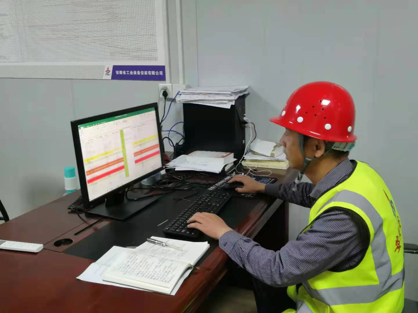 圖為項(xiàng)目副經(jīng)理共產(chǎn)黨員孫浩挑燈夜戰(zhàn)專心致志排查剩余工作量,記錄當(dāng)天工作日記
