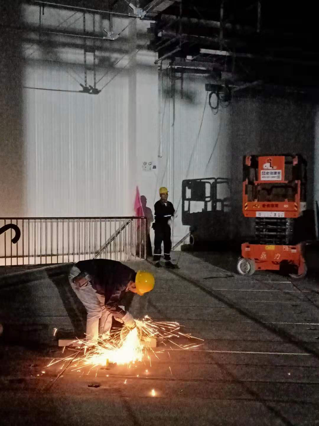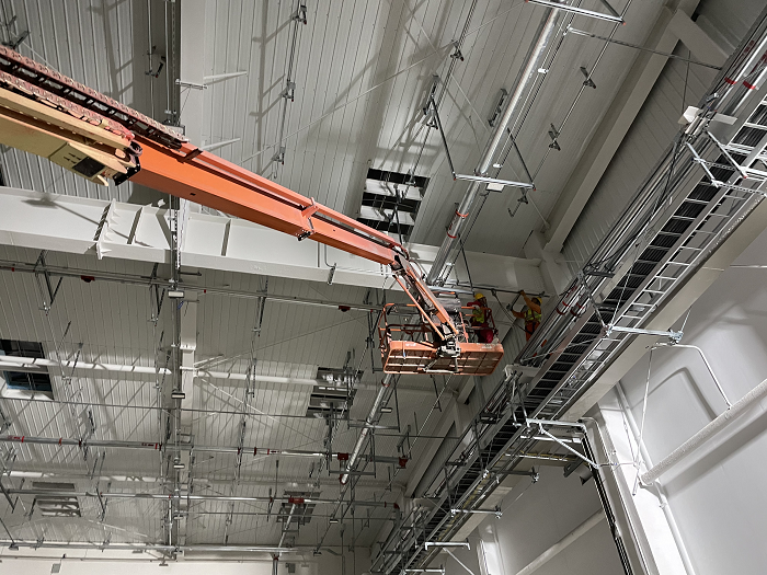 圖為室內(nèi)電氣班組正在進(jìn)行高天棚燈具安裝,對(duì)剩余工程量進(jìn)行最后的沖刺