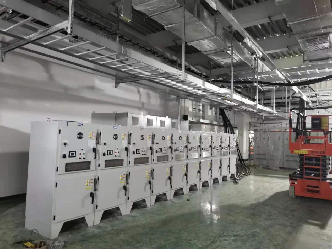圖為配電房?jī)?nèi)的配電柜已全部定位待接線安裝